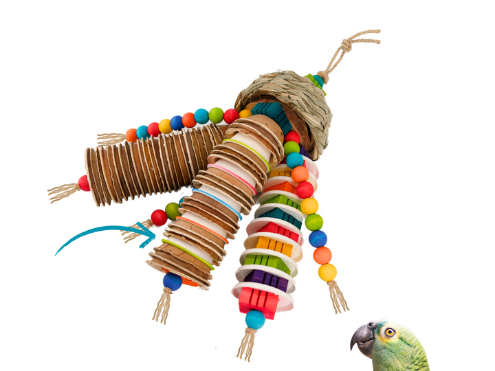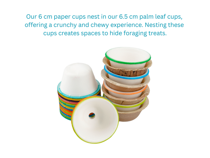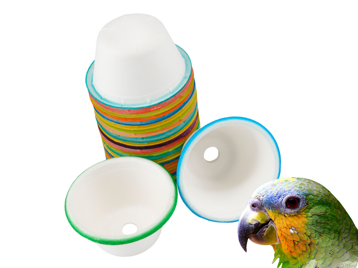 These colorful and chewy paper cups, made of all natural sugarcane fiber, are perfect for refilling our stainless steel poles and crafting bird toys. These parts can be used as treat cups, foot toys, and can be combined with other bird-safe materials to make custom playthings. All bird toys and parts we offer are free of coatings, waxes, chlorine bleach, plastics, and harmful dyes — just clean, safe enrichment you can trust.